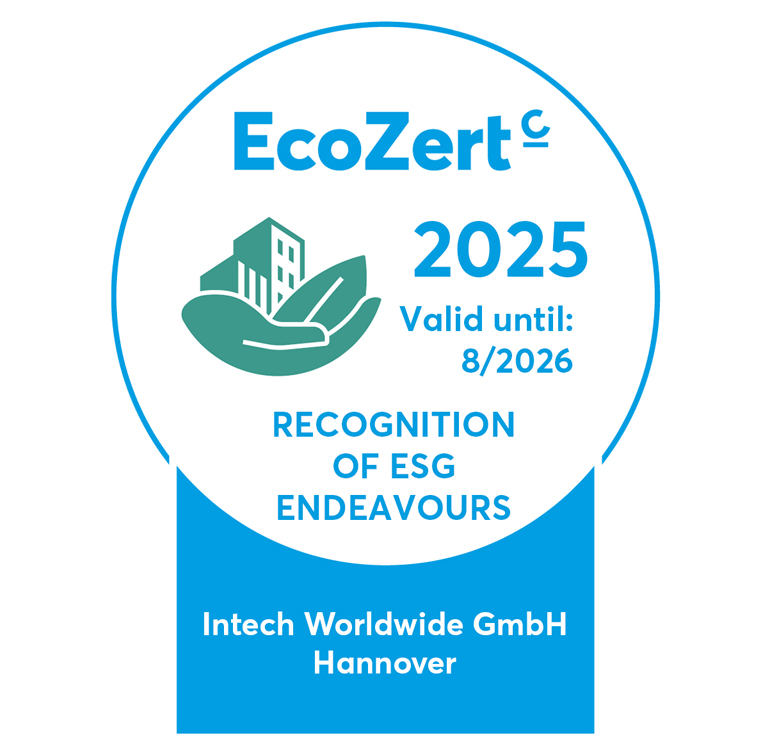 The EcoZert certificate from Creditreform Hannover-Celle Bissel KG recognises companies that can demonstrate sustainable, ecological and socially responsible business practices. It confirms that INTECH fulfils certain sustainability criteria, for example in the areas of environmental management, resource consumption and social responsibility. This makes INTECH's commitment to sustainable corporate management visible.