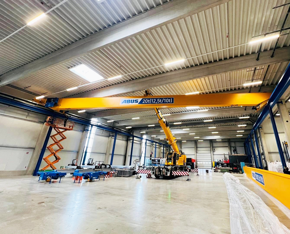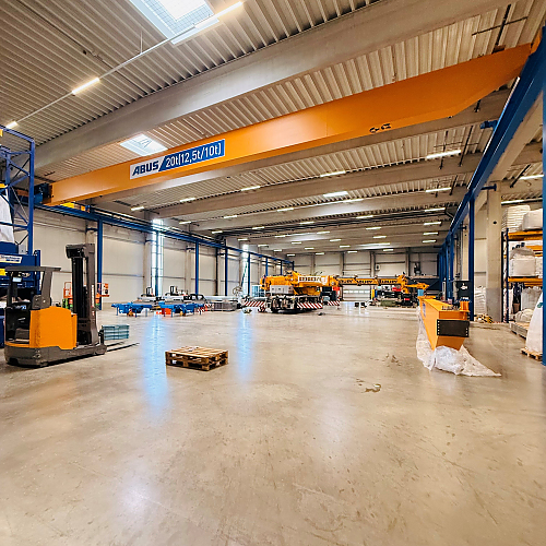 Auf dem Bild ist bereits ein entscheidender Teil dieses nächsten Entwicklungsschritts zu sehen: der Aufbau unserer neuen Krananlage. Die neuen Spritzgussmaschinen stehen bereit und werden in den kommenden Wochen montiert.