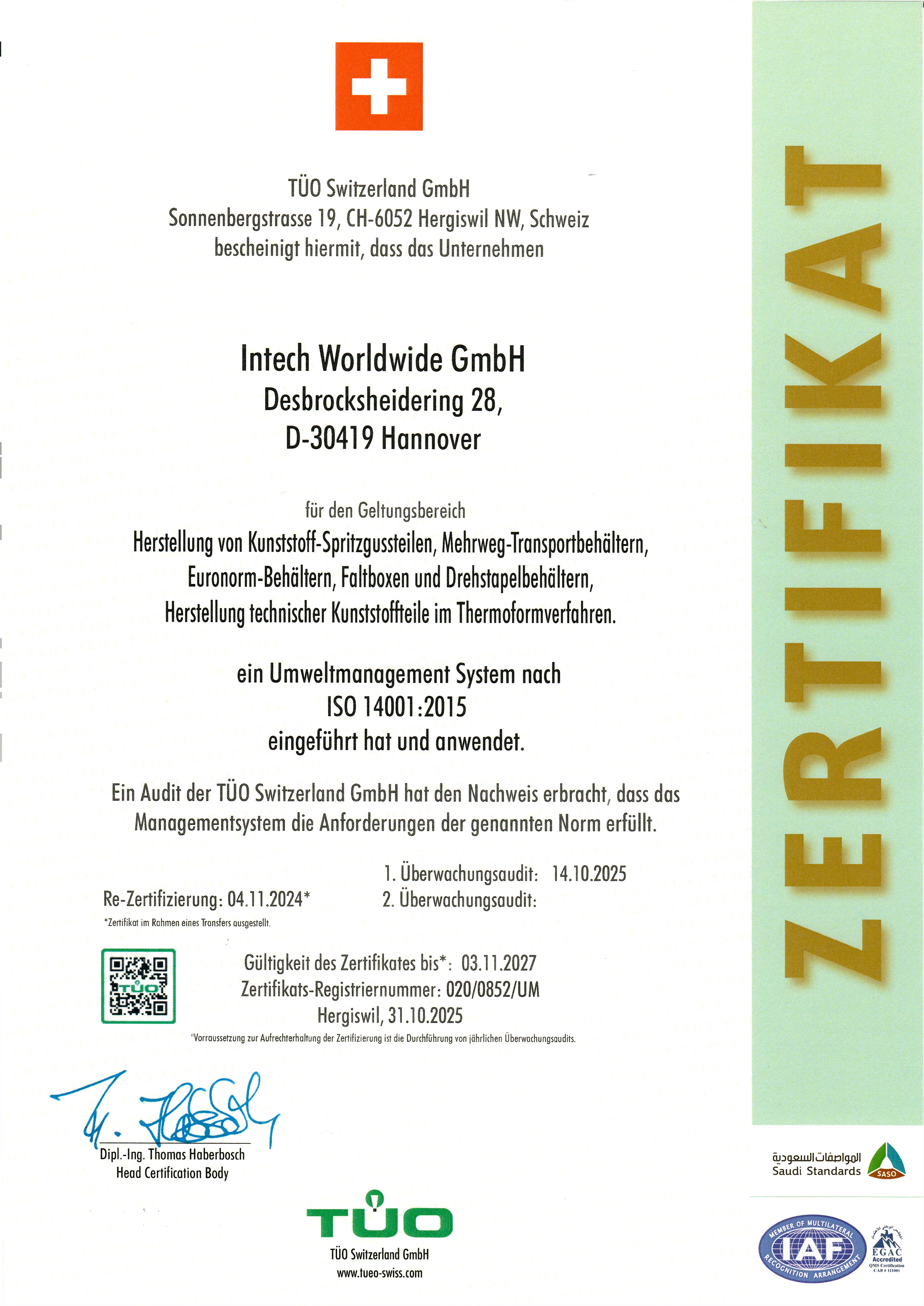 Neben unserem zertifizierten Qualitätsmanagement nach ISO 9001 setzen wir auch auf eine nachhaltige und umweltbewusste Unternehmensführung. Daher haben wir unser Umweltmanagementsystem nach ISO 14001 erfolgreich zertifizieren lassen.
