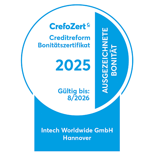 Die Creditreform ist eine Wirtschaftsauskunftei, die unabhängig Unternehmen auf Bonität und Sicherheit prüft. Wir von der Intech Worldwide GmbH wurden wiederholt nun mit dem begehrten CrefoZert ausgezeichnet.